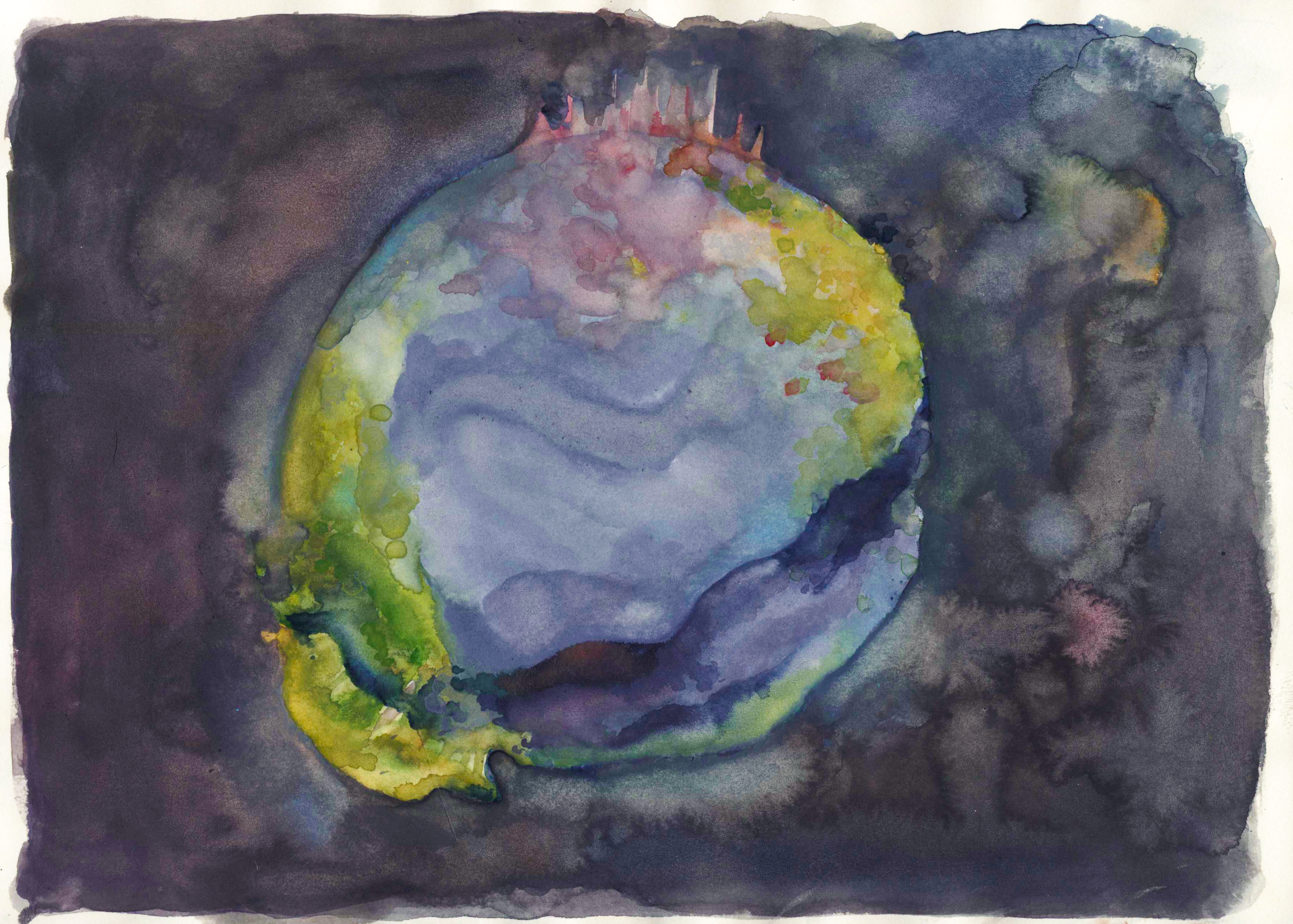 Watercolor, graphite and paper collage; 17x13”; 2025